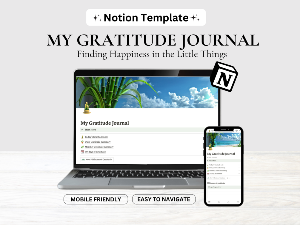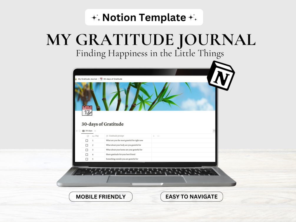 The journal also includes links to several other pages. These include "Today's Gratitude Note", "Daily Gratitude Summary", "Monthly Gratitude Summary", and "30-days of Gratitude", allowing you to further develop your gratitude practice and keep track of your daily entries.